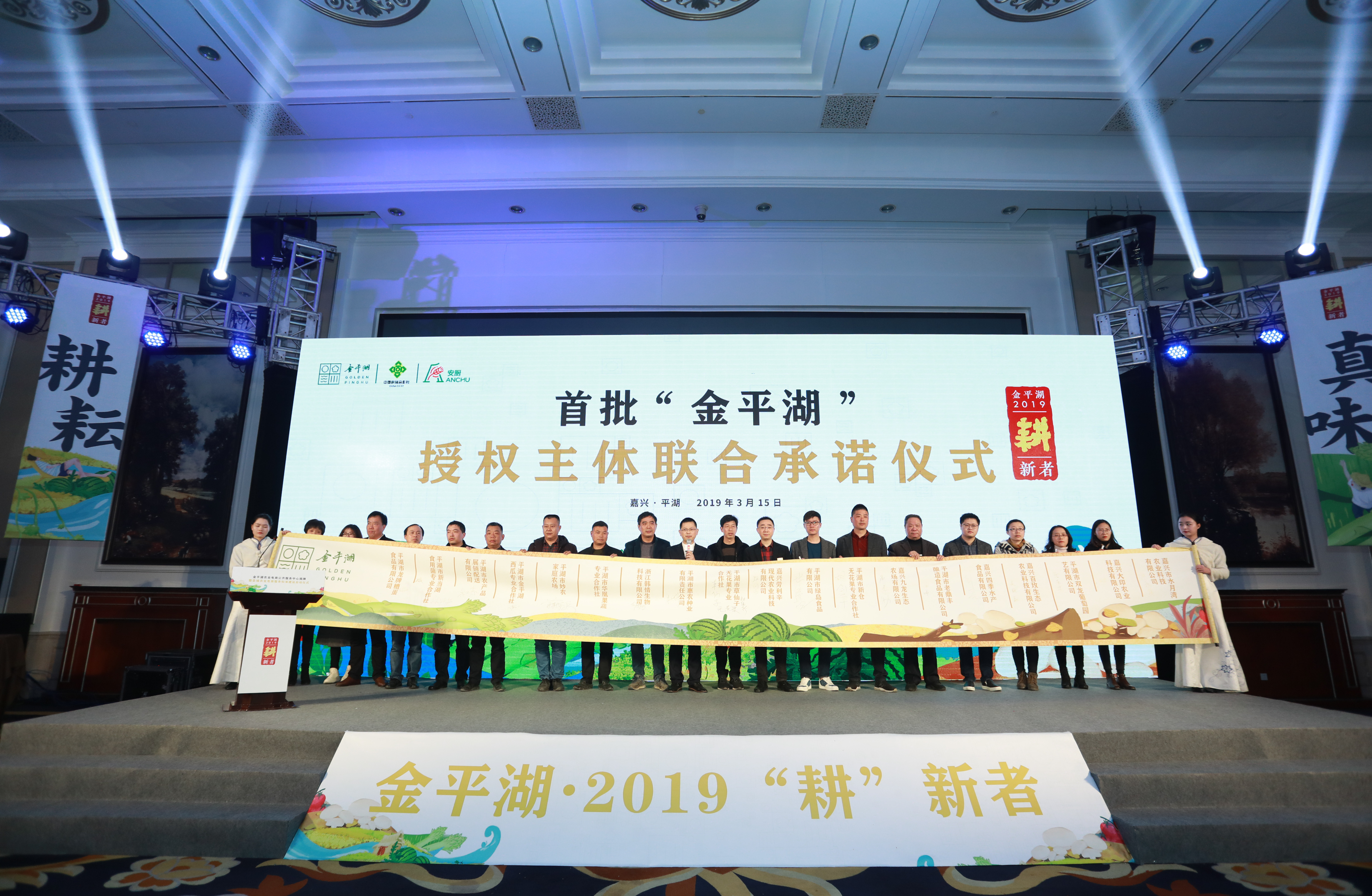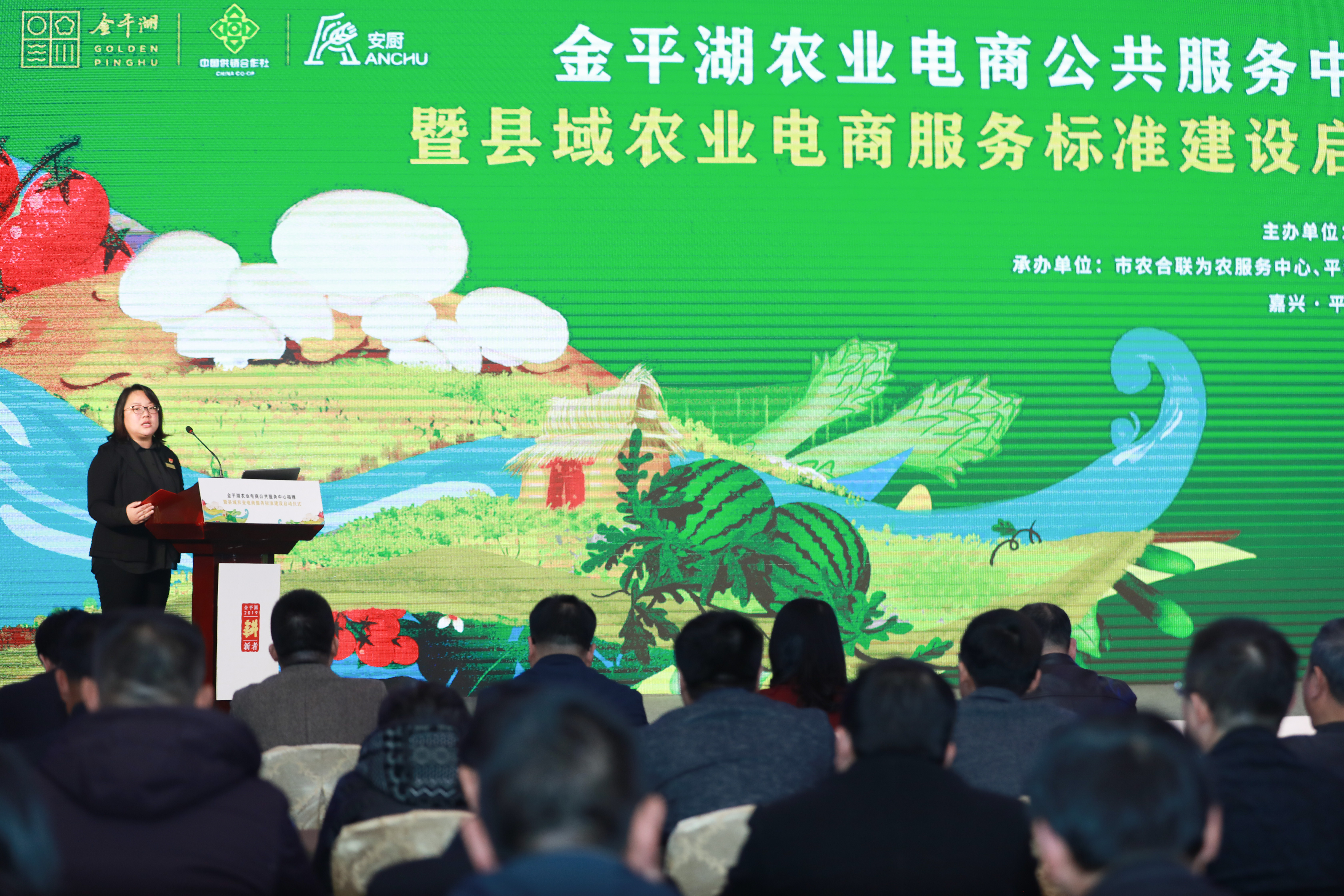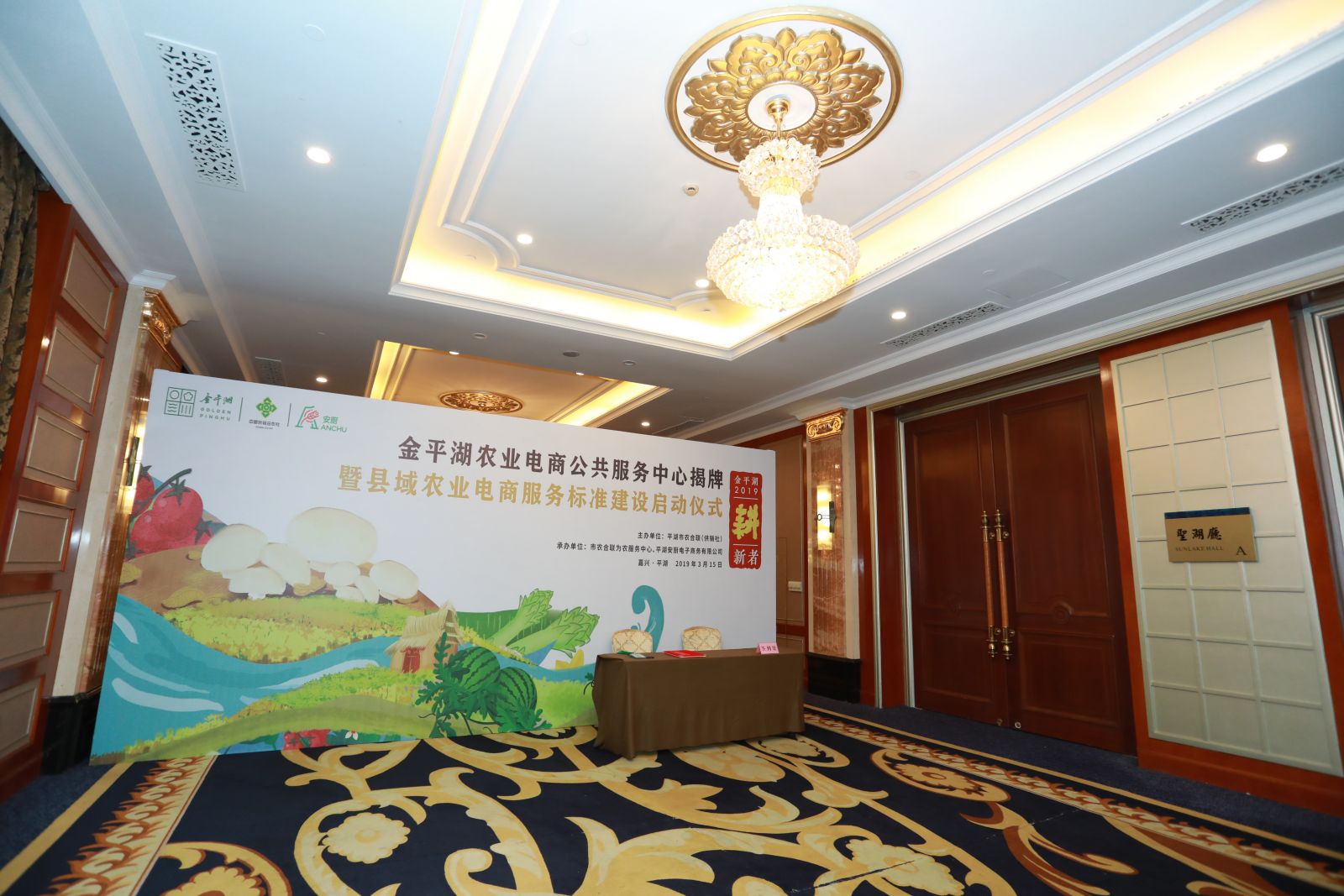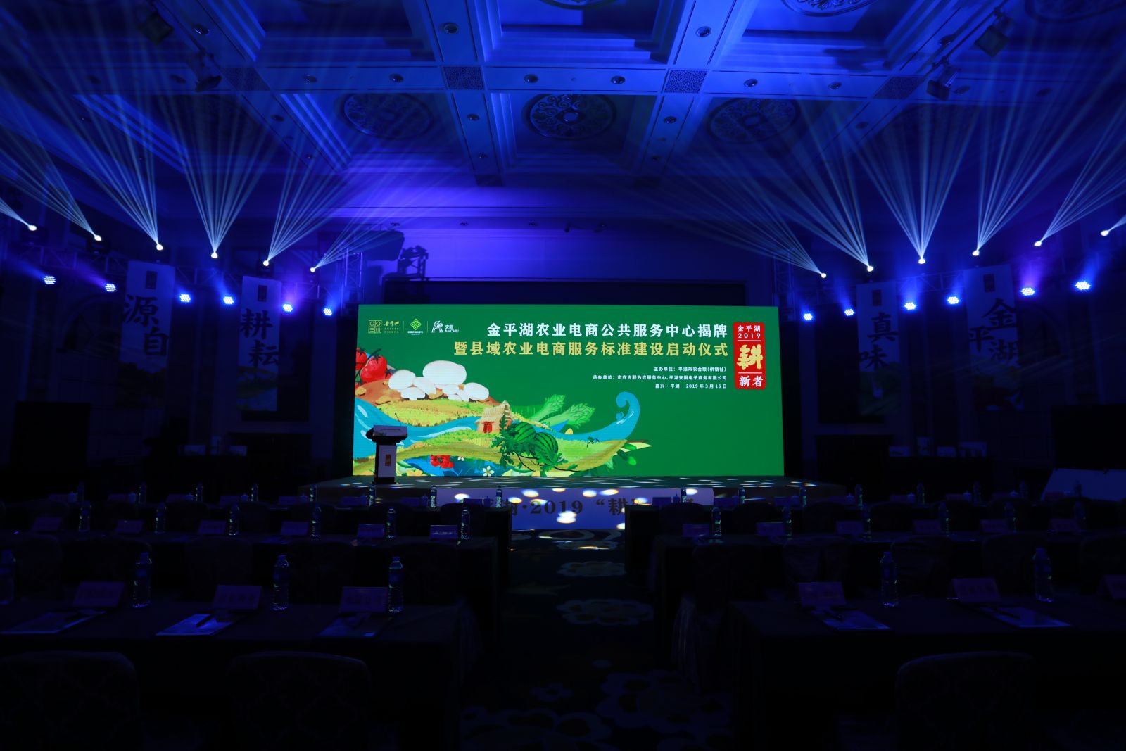 活動名稱:金平湖農(nóng)業(yè)電商公共服務(wù)中心揭牌暨農(nóng)業(yè)電商服務(wù)標(biāo)準(zhǔn)發(fā)布 活動地點:嘉興圣雷克大酒店 活動時間:2019.3.15 會議人數(shù):200 服務(wù)項目:設(shè)計、執(zhí)行