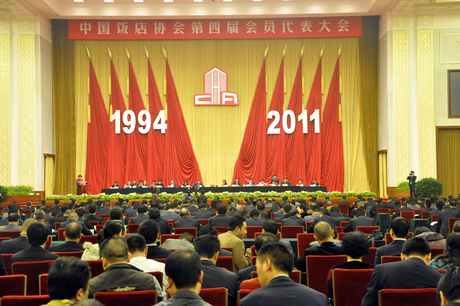 2011年11月1日上午9點,五年一次的中國飯店協(xié)會換屆大會在北京·人民大會堂隆重召開。中國飯店協(xié)會第三屆理事會按照章程規(guī)定進行換屆。中國飯店協(xié)會會長韓明女士代表第三屆理事會向第四屆會員代表大會報告工作,并請審議。韓明會長重點回顧了五年來取得了工作,飯店與餐飲業(yè)是民生產業(yè),對擴大內需、安置就業(yè)、提高生活品質,發(fā)揮著重要作用。到2010年年底,全國飯店餐飲企業(yè)近330萬家,從業(yè)人員2000多萬人,年營業(yè)收入近2萬億,占當年GDP的5%左右,每年以20%的速度快速增長。