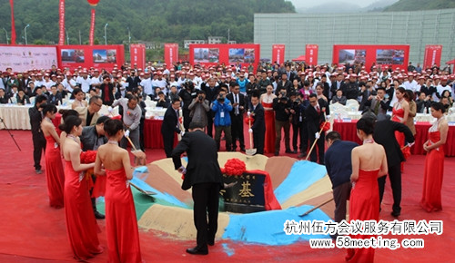 六、領(lǐng)導(dǎo)宣布開工:請(qǐng)重要領(lǐng)導(dǎo)為項(xiàng)目(宣布開工),彩帶機(jī)噴射出金銀兩種金箔片,會(huì)場(chǎng)四周的五彩煙霧同 時(shí)噴發(fā),編制成五彩的畫卷